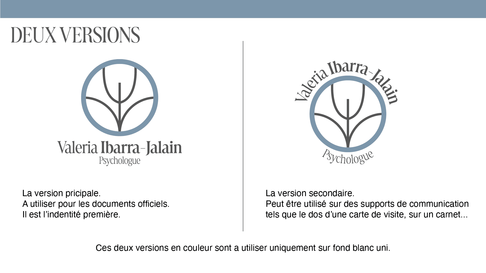 Le projet a abouti à la création d’un logo principal, accompagné d’une version secondaire adaptée à différents supports de communication (print et digital). Le résultat offre une identité visuelle simple et élégante, en phase avec les valeurs et la pratique de Valeria Ibarra-Jalain. Grâce à cette approche collaborative et à une direction artistique rigoureuse, l’image de marque gagne en cohérence et en impact, renforçant la visibilité de son activité et la confiance auprès de ses patients.